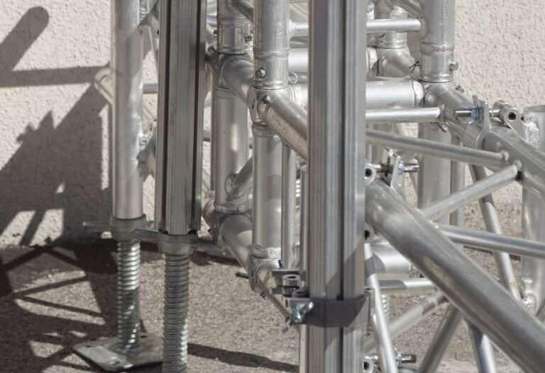 Mind az alumínium bilincsek, mind a Tomkostage TS3 színpadelem lábai duplabilinccsel egymáshoz rögzíthetőek, így viharbiztos tartószerkezetek építhetőek belőlük.