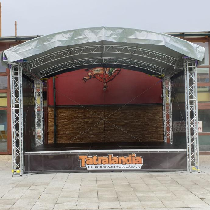 Fix lábas tető íves kialakítással. 8m x 6m színpadot lehet lefedni vele.